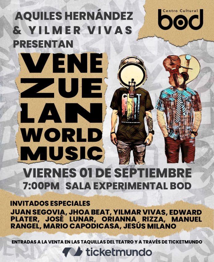 El viernes 1 de septiembre, a las 7:00 pm, en la Sala Experimental del BOD El violinista, mandolinista, director y compositor, Aquiles Hernández, junto a su gran amigo el baterista, compositor, multi-instrumentista y músico del Cirque du Soleil, Yilmer Vivas, deleitarán, en una sala íntima, a los espectadores con un concierto único: Venezuelan World Music.